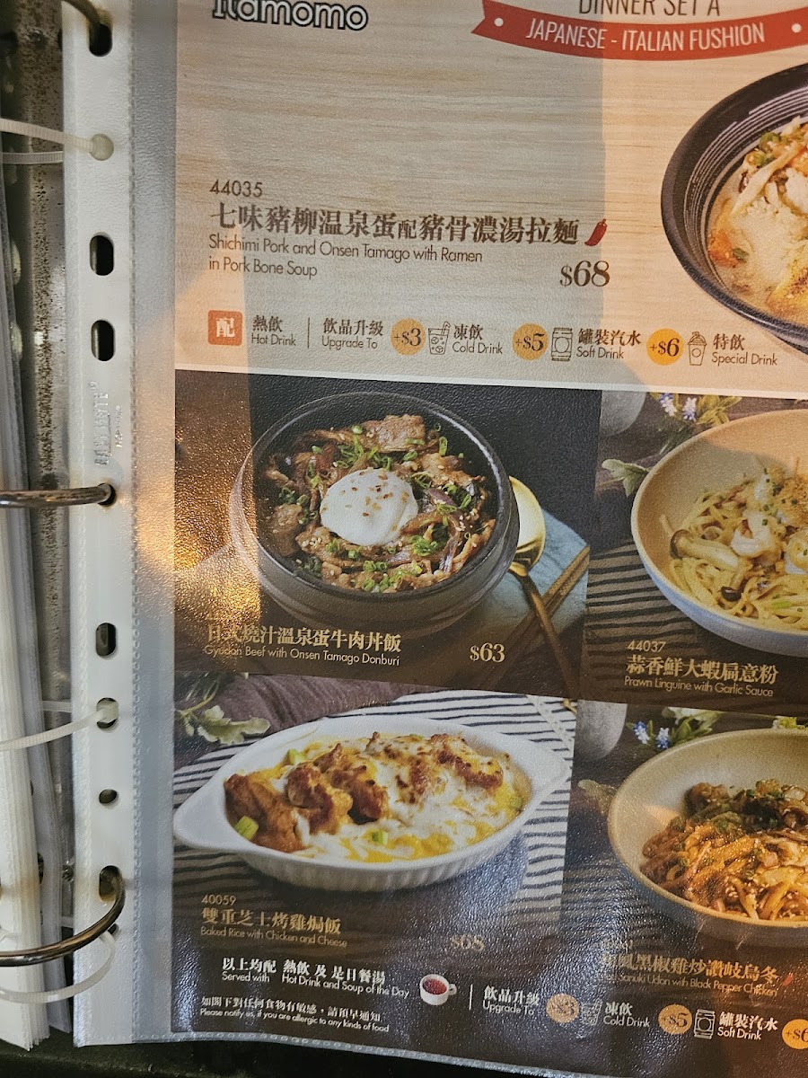 Starting your day with their morning offerings, you can indulge in Pan-Fried Pork Chop and Sausage with Instant Noodles or the delicious No Flip Over Easy Egg with Noodles in Italian Tomato Soup, each priced around HK$44. The noodle dishes are well-balanced, comforting, and perfect for the early riser.